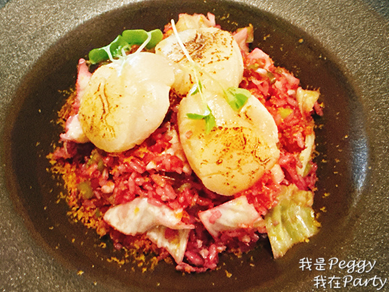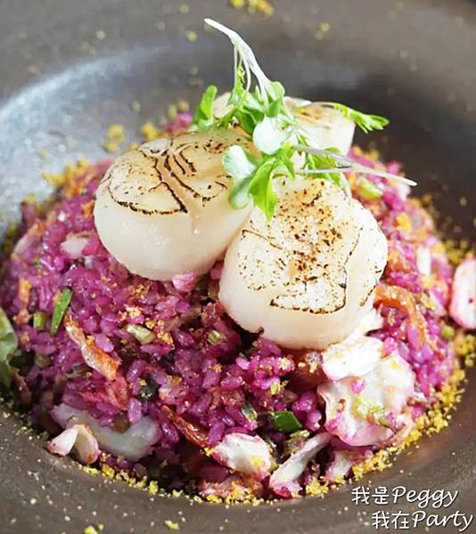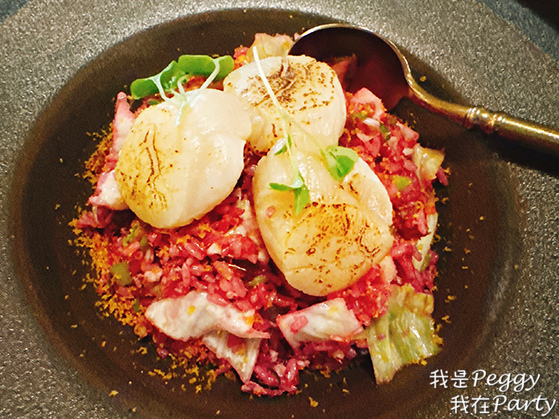 干貝表面炙燒,咬下去卻嫩到不行,超有海味。搭配金黃烏魚子碎,鹹香中