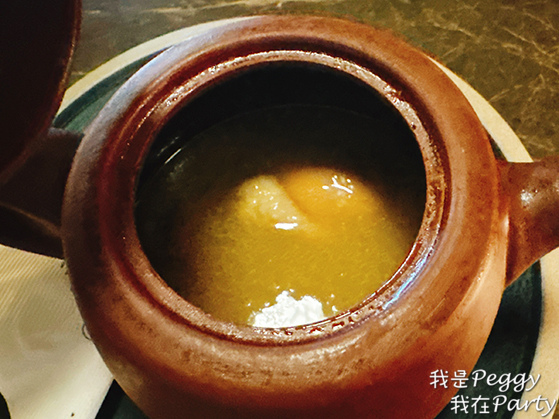 湯底選用老母雞、金華火腿與中藥材熬煮數小時,呈現的是淡金色、清澈卻