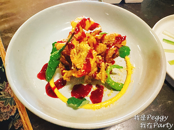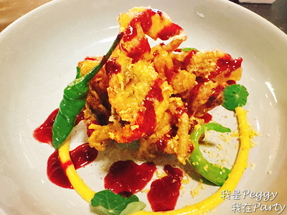 鹹蛋黃金沙的濃郁搭配外酥內嫩的軟殼蟹, 搭配的是洛神花製成的酸甜醬汁